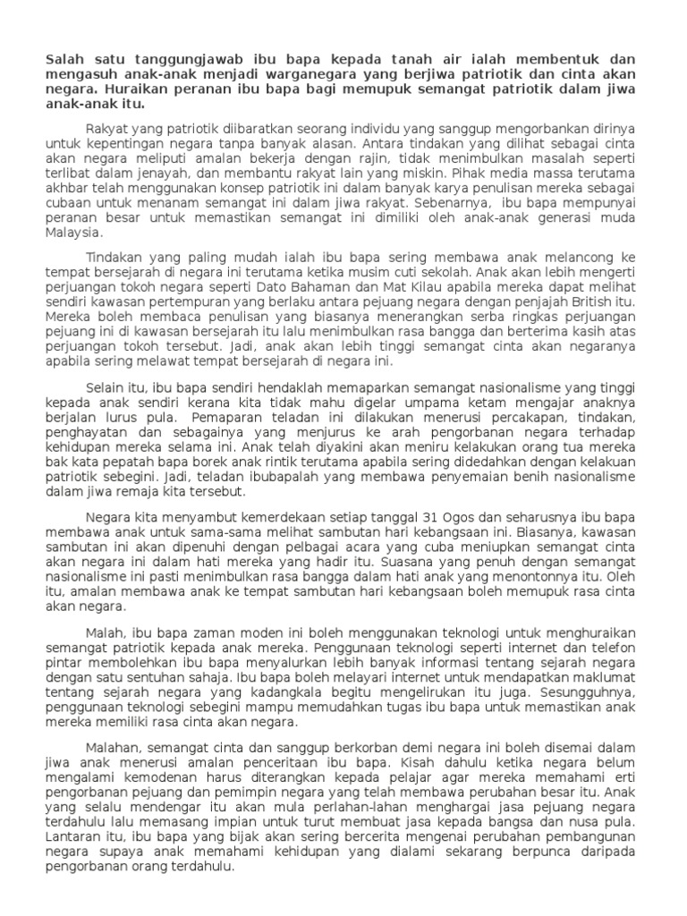 Sebagai contoh rakyat Malaysia amat bersyukur untuk mendiami sebuahnegara yang merdeka yang telah membawa simbol kemakmuran serta kemaruahan sejak 1957. Penerangan guru untuk cara menjawab esei bentuk 1. Hal ini dapat memberi kesedaran kepada masyarakat untuk memberi sepenuh taat setia kepada negara kerana para pejuang sanggup berkorban demi mempertahankan negara tercinta.